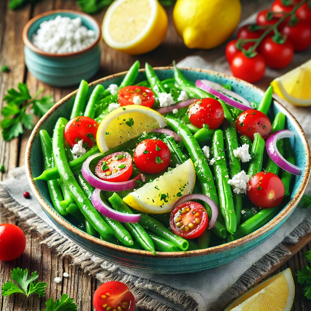 - In a large bowl, combine the blanched green beans, cherry tomatoes, red onion, feta cheese, and parsley.